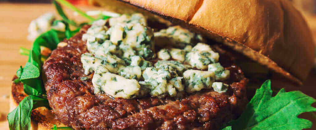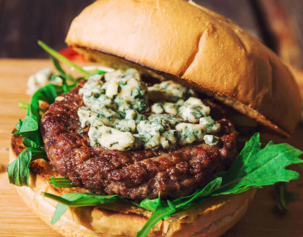 Combine meat with garlic, Worcestershire, parsley, salt and pepper, form 4 patties thinner at the center and thicker at the edges for even cooking. Also, the burgers will bulge as they cook, this will give the cooked burgers an even thickness. Cook patties 8 minutes turning once for medium doneness, 1 to 2 minutes less for rare patties, 1 to 2 minutes more for burgers that are medium well. In the last minute of cooking time, top burgers with a few slices of Cambozola blue.